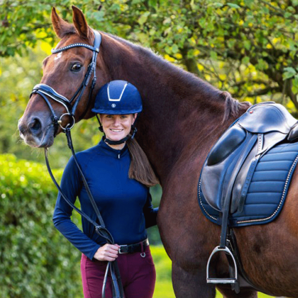 De BR rijhelm Omega Microfiber Glitter valt op door de extra grote zonneklep en de stijlvolle microfiber bekleding verfraaid met glittermateriaal. De helm is gemaakt van een lichtgewicht schaal van stevig ABS materiaal. Het glittermateriaal wordt omringd door een zilveren rand met zes langwerpige ventilatieopeningen. De helm is uitgerust met een verstelbare kinband afgewerkt met stijlvol synthetisch leder. De kinband is voorzien van een quick release gesp en een zachte kinbeschermer van Cooldry materiaal. De voering van Cooldry gecombineerd met mesh droogt snel en houdt het hoofd koel. De voering is volledig uitneembaar en kan in de wasmachine gewassen worden op 40°C. De draaischijf zorgt voor een perfecte pasvorm. De helm voldoet aan de CE VG1 01.040 2014-12 veiligheidsnormering.