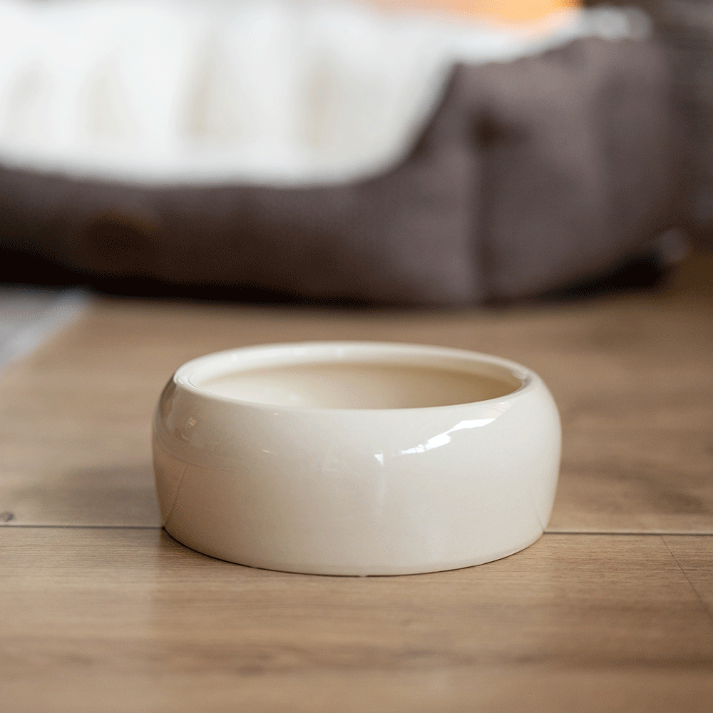 Keramische voer of drinkbakje met een inhoud van 750 ml. Kleur naturel, beige. Glanzende kom.