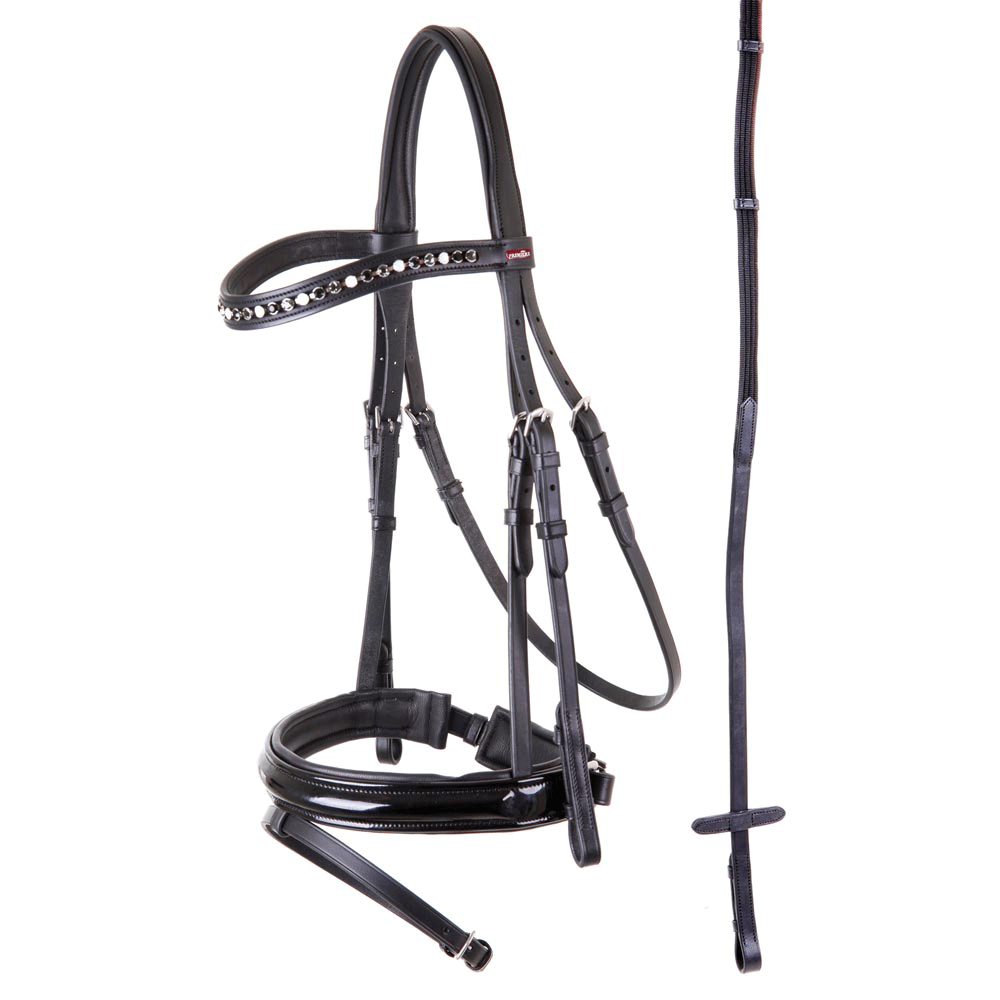Symmetrisch hoofdstel met een anatomisch gevormd, zacht gevoerd kopstuk dat aan beide zijden is teruggesneden voor extra vrijheid. Het licht gebogen frondeel is ingelegd met XL imitatie diamanten in drie kleuren (Basalt/Black/Opal) en is onderlegd met zacht leder. De brede (circa 4 cm) gecombineerde aansnoerneusriem met lakleder is rond gebombeerd, zacht gevoerd en is voorzien van een zacht gevoerde kaakbeschermer. De bakstukken zijn voorzien van blinde sluitingen. Het hoofdstel is voorzien van roestvrijstalen fournituren. De bijgeleverde linnen teugel heeft hand- en teugelstops en blinde sluitingen.