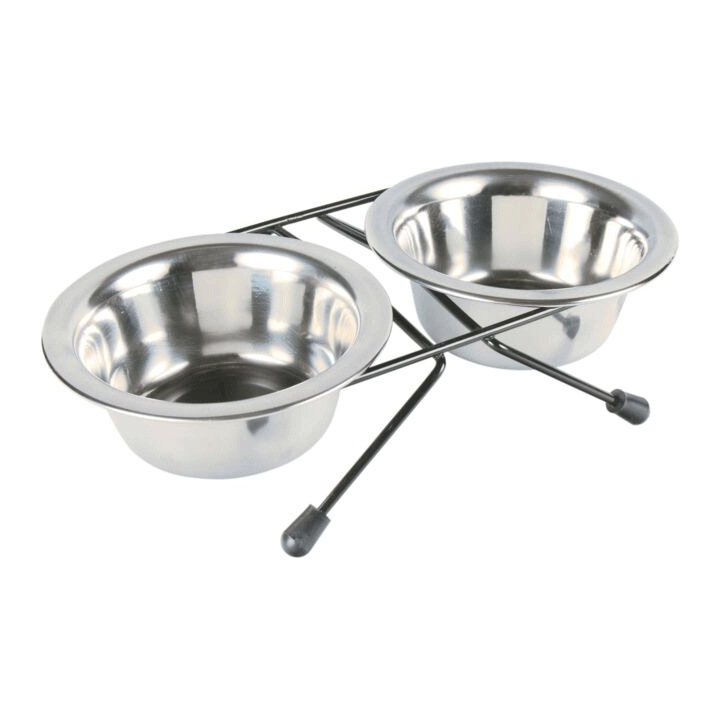 De Trixie Voer en Waterbak Set RVS/Metal 2 x 200 ml is een handige set van twee voerbakken of waterbakken voor de kat met houder, slipvast. Deze handige set voerbakken zorgt voor comfortabel eten. De set bestaat uit twee RVS bakken die te gebruiken zijn voor droogvoer, natvoer en water. Ze zijn vaatwasserbestendig en daardoor gemakkelijk te reinigen. De metalen houder lift de voerbakken wat van de grond, waardoor jouw kat een natuurlijke houding aanneemt bij het eten, wat de spijsvertering ten goede komt. Door de slipvaste voetjes van de houder verschuift de set niet tijdens het eten.